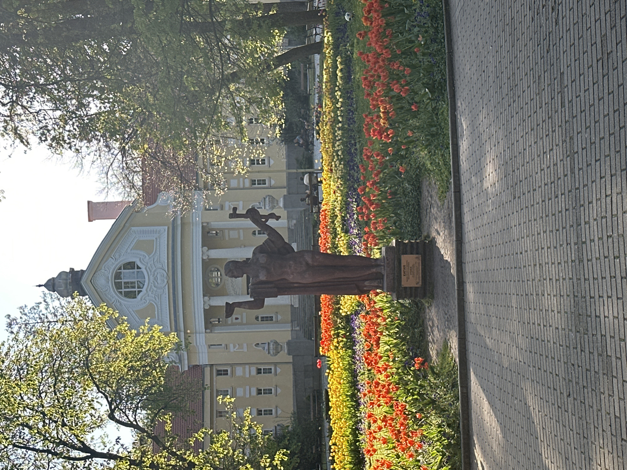 The image depicts a statue in what appears to be a park or garden setting in Bankya, Bulgaria. The statue is bronze and depicts a human figure. The statue is standing on a stone base. Behind the statue is a building with a pale yellow facade and white columns. In front of the statue is a flower bed with a variety of red, yellow, and purple flowers. To the right of the flower bed is a paved walkway made of gray bricks. The sky is clear and the sun is shining. Trees are present in the background. The scene appears to be well-maintained and peaceful.