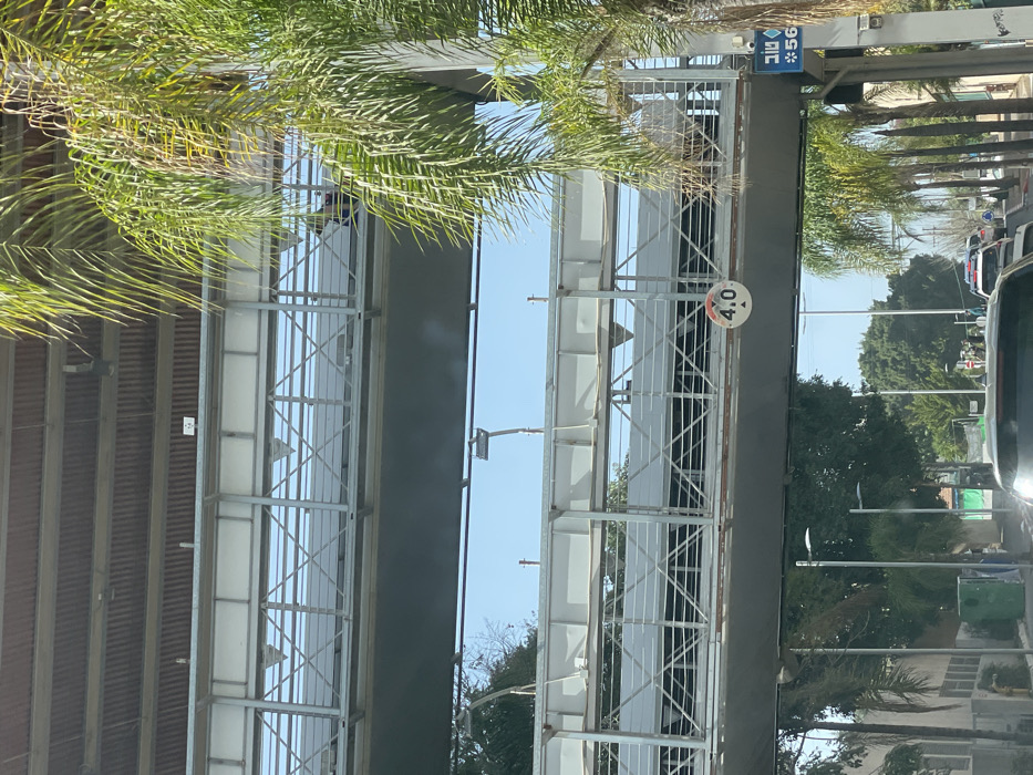 The image displays an urban street scene in Kfar Saba, Israel, characterized by prominent multi-level transportation infrastructure, likely in the vicinity of the Kfar Saba – Nordau railway station. The perspective is from inside a vehicle, looking forward and slightly upwards through the windshield, with the top of a dark vehicle visible in the immediate foreground. Two levels of a grey metal pedestrian bridge structure, featuring lattice railings and white opaque panels, horizontally bisect the frame. A circular white sign with a black border, denoting a 4.0-meter height clearance, hangs from the lower pedestrian bridge. To the right, partially obscured by palm fronds, a blue rectangular sign with white Hebrew text "שוב" and the number "56" is visible, identifying a bus stop. A single individual is discernible on the upper pedestrian bridge towards the right, partially concealed by foliage. Below the bridge structure, a street extends into the background, occupied by multiple vehicles, indicating traffic flow. Several indistinct figures are present on the street level or adjacent sidewalk. The street is lined with multiple streetlights and green trees, including prominent palm trees. A green dumpster is visible on the left side of the street, near a building. Above the pedestrian bridges, the corrugated brown underside of an elevated structure, consistent with a railway overpass or a higher road bridge, is visible. The sky is clear blue, indicating daytime conditions.