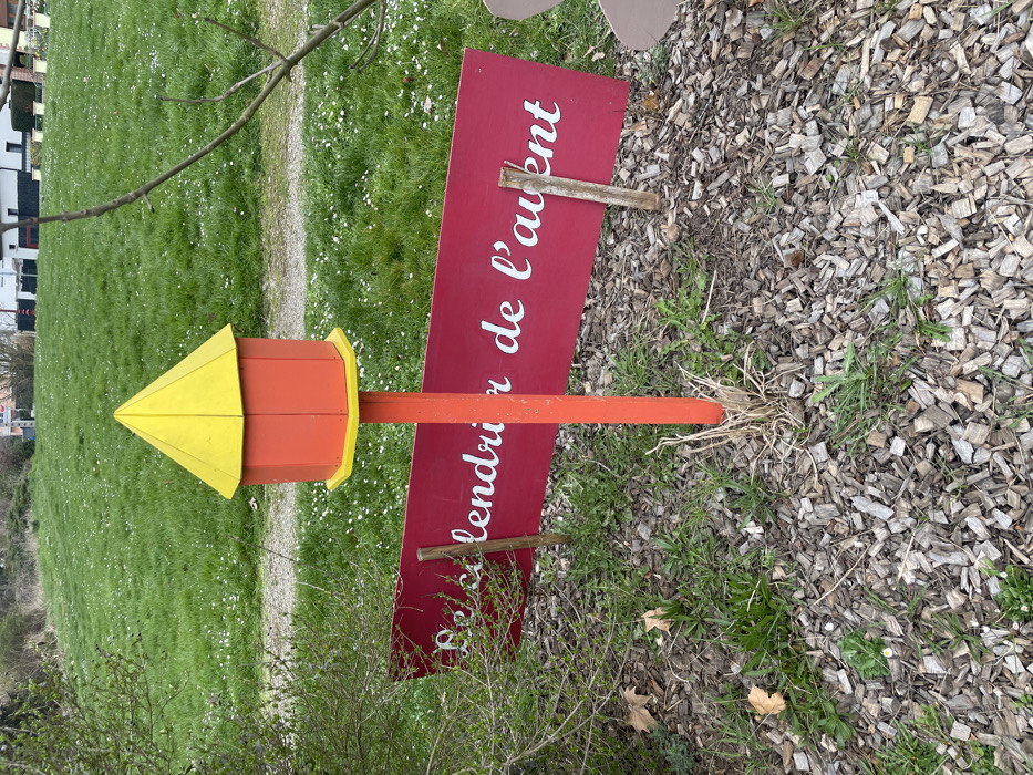 The image depicts an outdoor environment in Holtzheim, France. Central to the foreground is an erected hexagonal structure, approximately one meter in height, featuring an orange body, a yellow conical roof, and a yellow circular base. This structure is mounted on a cylindrical orange wooden pole, secured in a ground area covered with light-colored wood chips, green grass, and dried vegetative matter. Immediately behind and partially to the left of this pole, a horizontal rectangular sign, painted red with white serif lettering, displays the text "Le calendrier de l'avent." The sign is supported by two unpainted wooden stakes embedded in the wood-chipped and grassy ground. To the left of the sign, a green deciduous bush is present. On the right, bare tree branches extend into the frame. The midground features an expansive green lawn containing numerous small white flowers. A narrow, light-colored dirt path traverses this lawn. In the distant background, residential buildings with dark roofs and light walls are visible among sparse trees and foliage under an indistinct sky. No human figures or active subjects are depicted within the scene.