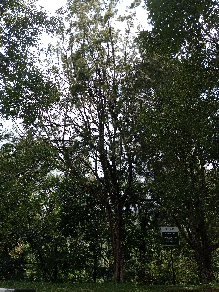 A lush, green outdoor scene features a tall, slender tree taking center stage, surrounded by denser, leafy trees and foliage. A sign stands amongst the trees. The leaves suggest a natural, possibly forested, environment. Light filters through the tree branches, creating a bright contrast against the darker greenery. The bottom edge includes a black stripe, possibly a barrier or pathway.