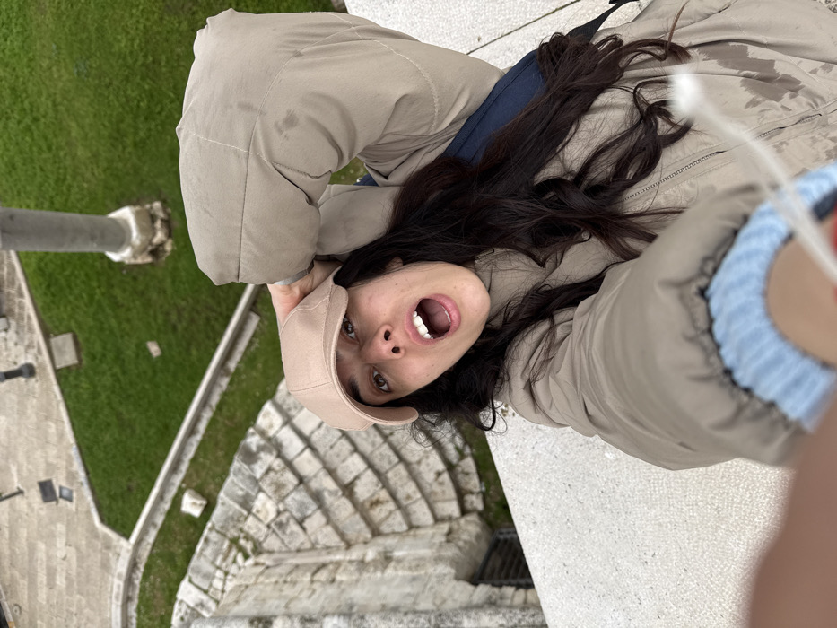 A selfie-style image depicts a young adult female from an elevated vantage point at the Swabian Castle (Castello Svevo) in Bari, Italy
