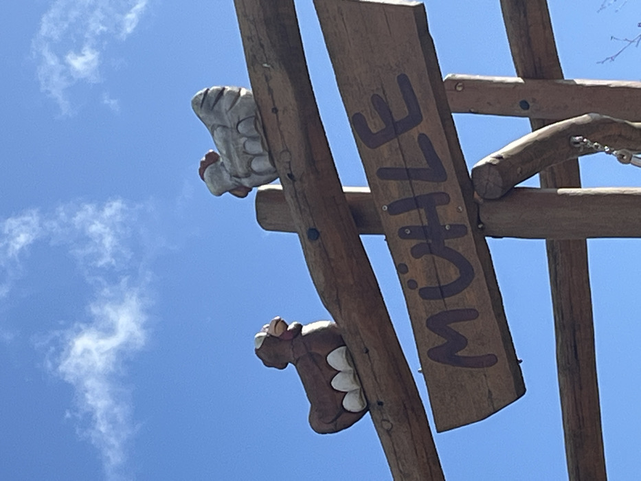 The scene depicts an outdoor setting in Mondercange, Luxembourg, under a clear blue sky with sparse white cirrocumulus clouds. A rustic wooden structure, likely an archway or playground component, dominates the view. Two carved wooden figures resembling hens or chickens are positioned on a prominent horizontal wooden beam. The figure on the left is brown with white accents, depicted sitting on three white egg-like forms. The figure on the right is white with a red comb and wattle, facing left. Below this top beam, a wider horizontal wooden plank is affixed, bearing the dark capital letters "MÜHLE." The wooden components of the structure are joined by visible metal fasteners. A metal chain with a ring is partially visible, hanging from a lower vertical wooden support on the right side of the frame. No individuals are present.
