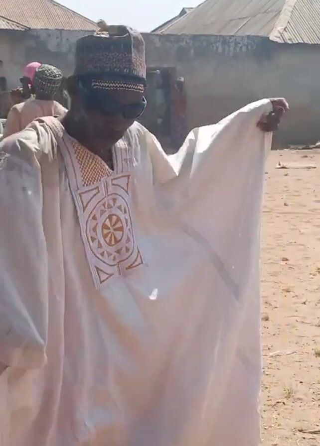 A man dressed in traditional clothing, wearing sunglasses and a patterned hat, stands in the center of a sandy courtyard, holding the sides of his robe open. Other people dressed similarly can be seen in the background, along with buildings with corrugated metal roofs. A scooter is also visible. He's smiling and talking to the camera. There are other people moving around behind him, and what sounds like music can be heard.