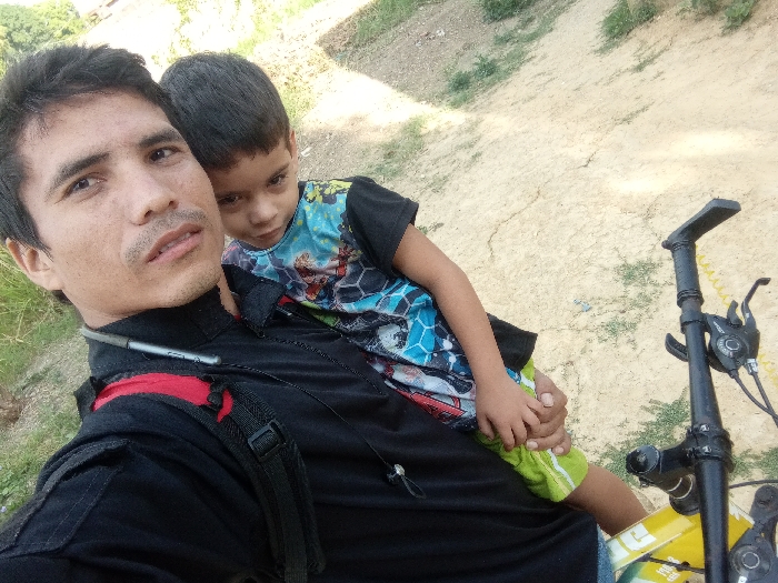 The image displays an adult male holding a young child, positioned outdoors in Tinaquillo, Venezuela