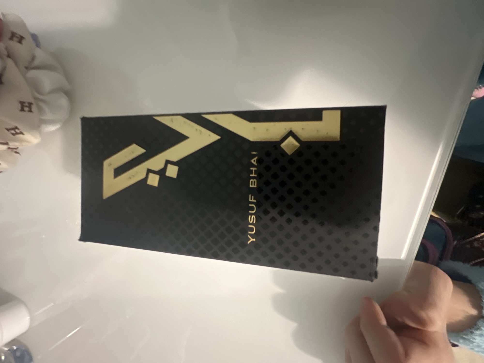 A slightly rotated, medium-angle, close-up shot shows a rectangular, black box with gold-colored Arabic writing that includes the name "Yusuf Bhai". The box has a subtle, repeating dot pattern. The box is placed on a white, glossy surface. Part of a white scrunchie with repeating "H" letters is visible to the left. A hand and part of a baby wearing blue clothes are visible on the right side of the frame. The photograph appears to have been taken indoors. The location is not clear from the image.