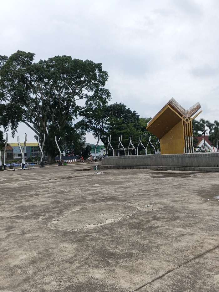 The image presents a concrete plaza within Bạch Đằng Wharf Park (Công viên Bến Bạch Đằng), situated in District 1, Ho Chi Minh City, Vietnam. The sky is uniformly overcast. In the mid-ground to the right, a golden-hued monument, geometrically configured to resemble an open book or stylized upward-curving panels, stands upon a circular, tiered concrete plinth. Adjacent and to the left of this monument, a series of identical white, curvilinear, vertical decorative elements are arrayed linearly. A large, mature tree with dense green foliage occupies the left side of the frame, its canopy extending towards the center. Other trees are visible in the background. The background reveals several structures: a building with a prominent reddish-orange tiled roof to the far right, and a multi-story building featuring blue accents further left. Indistinct human figures, some on bicycles, traverse a pathway in the distant background, positioned behind the white decorative elements. The foreground and mid-ground consist of a grey concrete pavement, exhibiting surface wear, including visible cracks and discolored patches. Several shallow puddles or damp areas are present on the concrete surface. On the far left, two-wheeled vehicles, likely scooters, are partially visible, parked near the edge of the plaza.