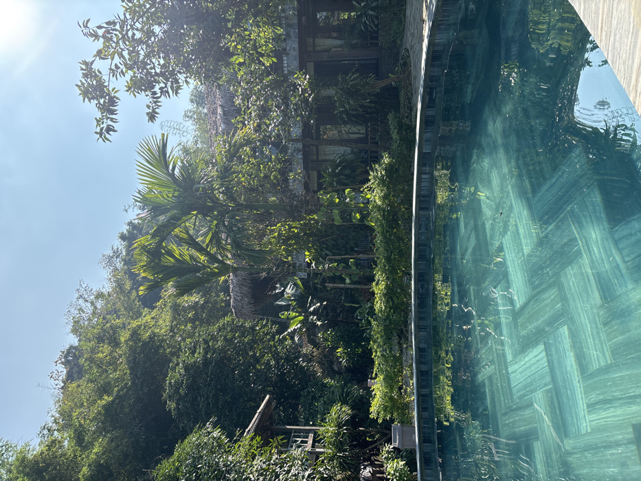 A verdant landscape meets clear turquoise water. Lush green vegetation cascades down a hillside, dotted with trees and traditional thatched-roof structures. A tall palm tree stands prominently amongst the foliage. The still water mirrors the surroundings, creating a shimmering reflection of the sky, trees, and structures, enhancing the tranquility of the scene.