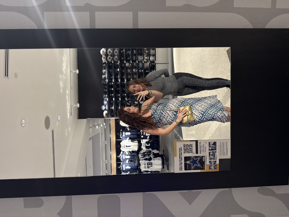 Two women are posing for a picture in a mirror inside a store. One woman has curly brown hair and is wearing a blue and white dress with a gold purse. The other woman has short brown hair and is wearing a gray top and black leggings. The mirror reflects a wall of Dallas Cowboys apparel, including hats and jerseys. A promotional sign with a QR code and the Dallas Cowboys logo is visible on the right side of the mirror.