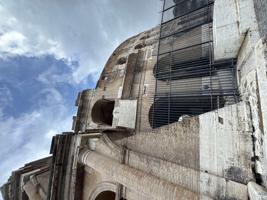 - "An upward-angled exterior view captures a section of the Colosseum in Rome, Italy, under a partially cloudy sky" by FM-BZgWn2, licensed under CC BY 4.0