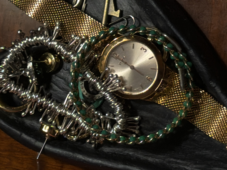- "A gold-banded watch rests among various metallic trinkets on a dark surface" by FM-tkmaw2, licensed under CC BY 4.0