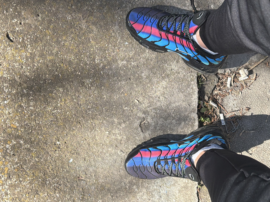 An overhead, static photograph captures the lower legs and feet of an individual standing on a weathered concrete surface in Veliko Tarnovo, Bulgaria. The subject wears black athletic trousers and white ankle socks. On their feet are a pair of Nike Air Max Plus sneakers, characterized by black soles and an upper featuring a gradient color scheme transitioning from black to dark blue, then bright blue, and a prominent central red stripe, secured with black dotted laces. The concrete ground exhibits a coarse, light grey texture with scattered patches of yellow-green lichen or moss. A pronounced linear crack extends across the foreground, between the individual's feet, containing accumulated debris including dried leaves, small twigs, several white cigarette butts, and sparse green plant growth. Defined shadows cast by the shoes and legs onto the concrete indicate direct sunlight from above.