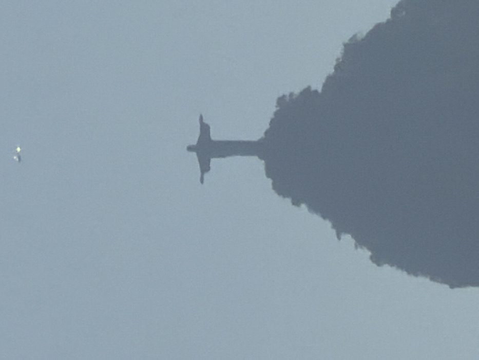 A cloudy sky with a dark, silhouetted shape resembling the Christ the Redeemer statue reflected. The shape's right side appears less defined, blending into a dark mass. A faint, small, light-reflecting object is visible on the left side of the image, further away from the central statue shape. The overall scene is hazy, contributing to the dreamlike quality of the reflected statue and the surrounding sky.