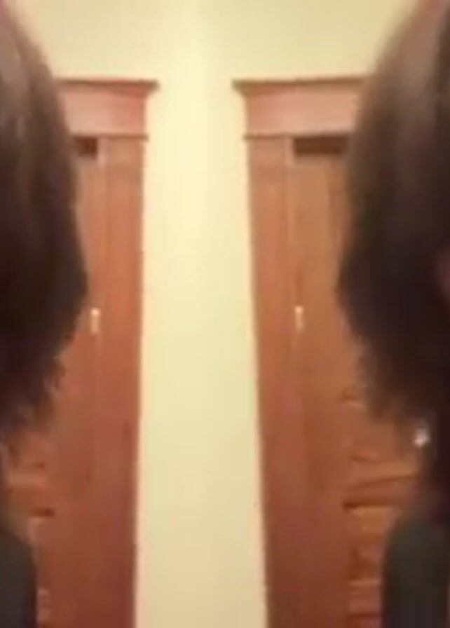 mirrored image of a person with shoulder-length brown hair and bangs. They are wearing a dark top. Behind them are ornate wooden doors. The person is looking downwards. The lighting is soft and warm.