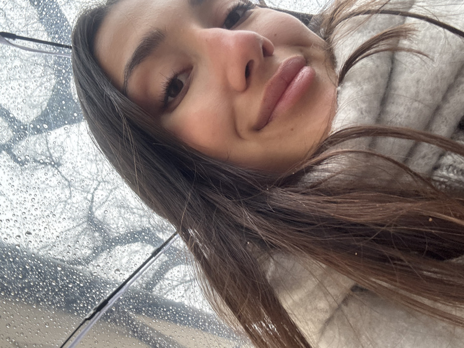 A close-up, low-angle portrait features a female individual with long brown hair, fair skin, and dark eyes, wearing a light-colored knitted scarf. Her lips are closed with a slight upturn suggesting a subtle smile. Small white particles are visible in her hair. Above her, a clear or translucent umbrella is open, covered extensively with raindrops, indicating active precipitation. Through the wet umbrella, blurred silhouettes of bare tree branches are discernible against a bright, overcast sky, suggesting a cold weather environment. The scene takes place in Subotica, Serbia.