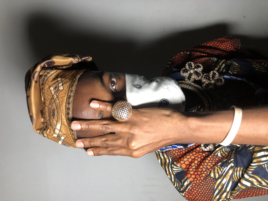 A person with dark skin and a patterned headwrap covers their face with a paisley bandana. A large, golden spherical ring adorns their hand. An orange and blue patterned garment is visible, embellished with flower-shaped brooches. A white bracelet is worn on the visible arm. The background appears to be a plain grey wall, casting a shadow behind the subject.