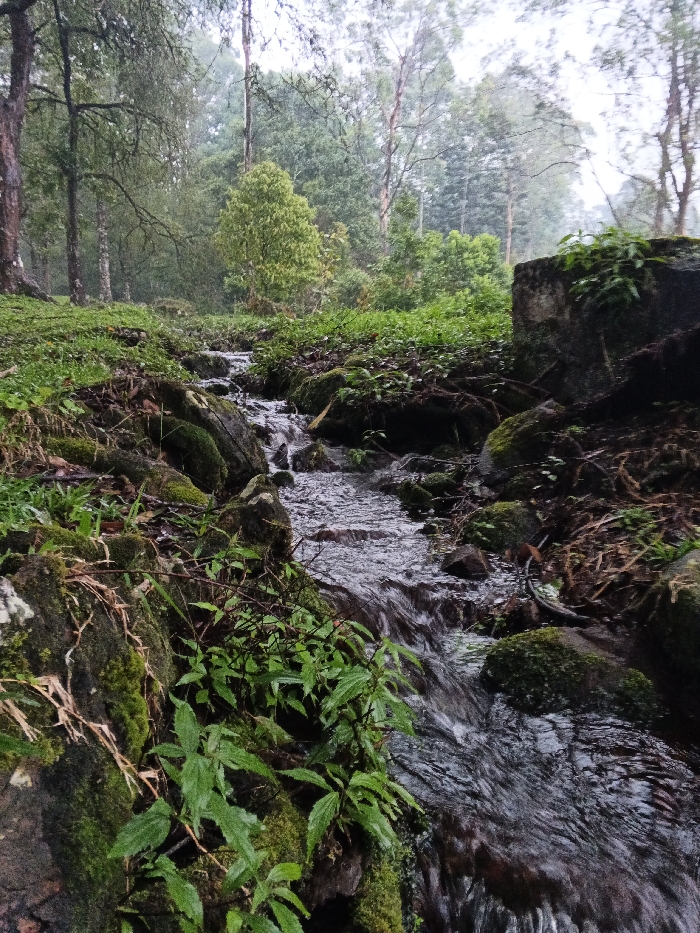 A small stream flows rapidly over rocks covered in green moss and vibrant green plants. The water appears dark and shadowed, contrasting with the lush green vegetation. The setting is a forest with trees visible in the background and a concrete structure on the right. The scene suggests a damp, possibly rainy environment.
