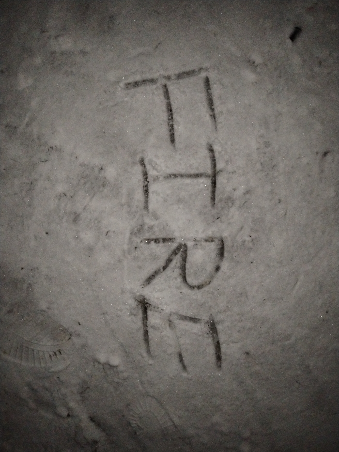 The word "FIRE" is written vertically in snow. The letters are roughly formed with simple lines. The background is also snow-covered, creating a monochromatic scene. A footprint is visible in the lower-left corner. The image has a grainy texture and the lighting suggests it may be nighttime or low-light conditions.