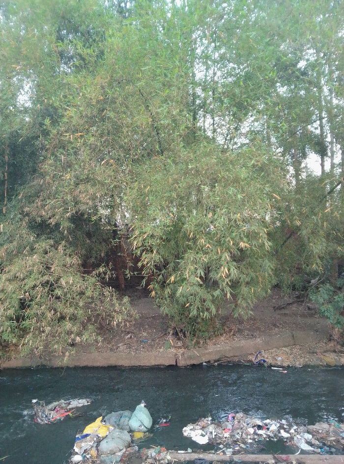 The image displays a section of a heavily polluted waterway, likely a river or canal, viewed from an elevated perspective. The dark, flowing water in the foreground is largely obscured by a dense accumulation of solid waste. This refuse includes several bundled sacks of varying sizes, numerous plastic bags (some yellow, light blue, and white), and a substantial quantity of unidentifiable debris. The riverbank on the opposite side consists of dark soil, partially reinforced at the waterline by a concrete or stone structure. Above this bank, the background is dominated by a thick growth of tall, green bamboo plants, some exhibiting yellowish or light brown leaves. Taller, darker tree trunks are partially visible through the dense bamboo foliage. The ground directly beneath the vegetation appears as dark earth with sparse, scattered litter. No individuals or specific identifying landmarks are present within the frame. While the scene is consistent with environmental conditions along polluted waterways in urban areas of Nairobi, Kenya, the precise location within the city cannot be determined from the visual information provided.