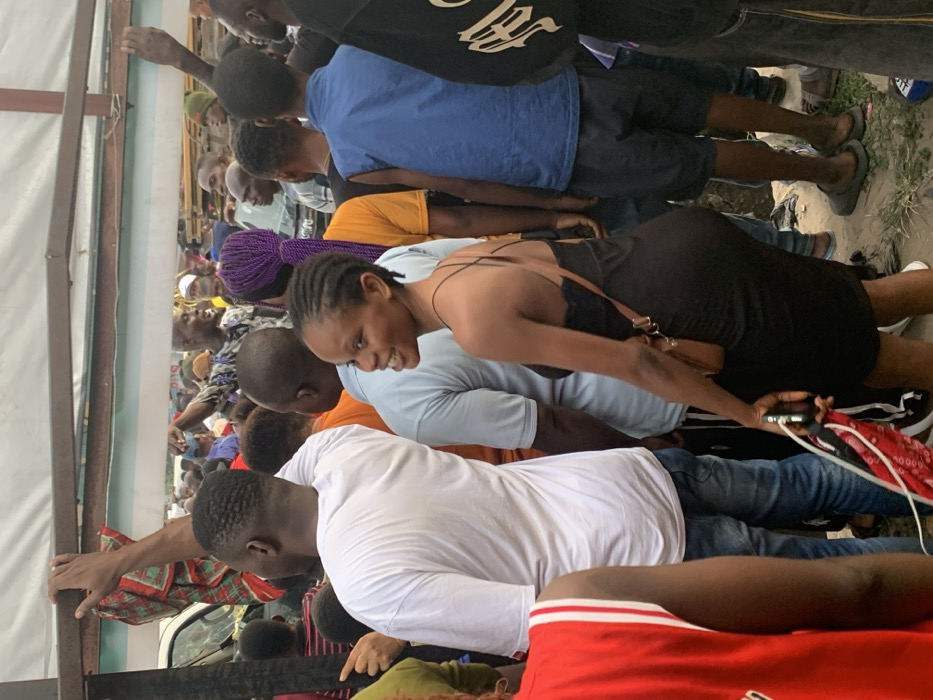 A dense crowd of people, mostly Black, are gathered. Individuals wear a variety of clothing, including a blue shirt, black dress, white shirt, and red shorts. One woman in a black dress smiles and holds a phone. Some people are looking towards something out of view, while others are engaged in other activities. The setting appears to be outdoors, possibly under a tent or shelter.