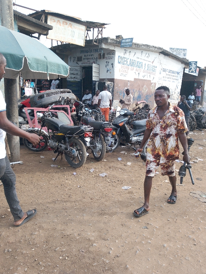 An outdoor scene features an individual walking with mechanical parts in hand, seemingly through a junkyard or marketplace with motorcycles and various vehicle parts scattered around