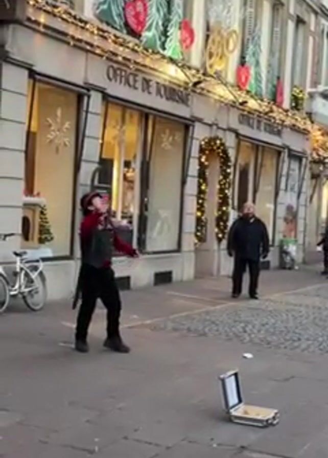 juggler performing on a cobblestone street in front of a building decorated for the holidays. The building houses an "Office de Tourisme". The juggler, wearing a red shirt, black vest, black pants, and a hat, is juggling three green clubs. A silver briefcase sits open on the ground. People are walking by in the background. A bicycle is parked nearby.