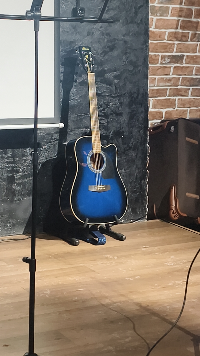 An indoor scene, location within Chaikovsky, Russia unidentifiable from visual evidence, presents a static arrangement of musical equipment. A blue sunburst Ibanez acoustic guitar, featuring a cutaway body and six metal strings, stands centrally on a black metal floor stand. A blue and black patterned guitar strap is draped over the base of the stand. To the immediate left, a black metal vertical stand, consistent with a microphone or instrument stand, is partially visible. The background wall on the left is dark and textured, partially revealing a white rectangular projection screen. The wall on the right is constructed of red bricks with light mortar. A dark brown object, potentially a hard instrument case or amplifier, with light brown trim and corner hardware, rests against the brick wall on the lower right. The floor is light-toned wooden planking. A black electrical cable extends across the floor from the right side. No individuals are present in the image.