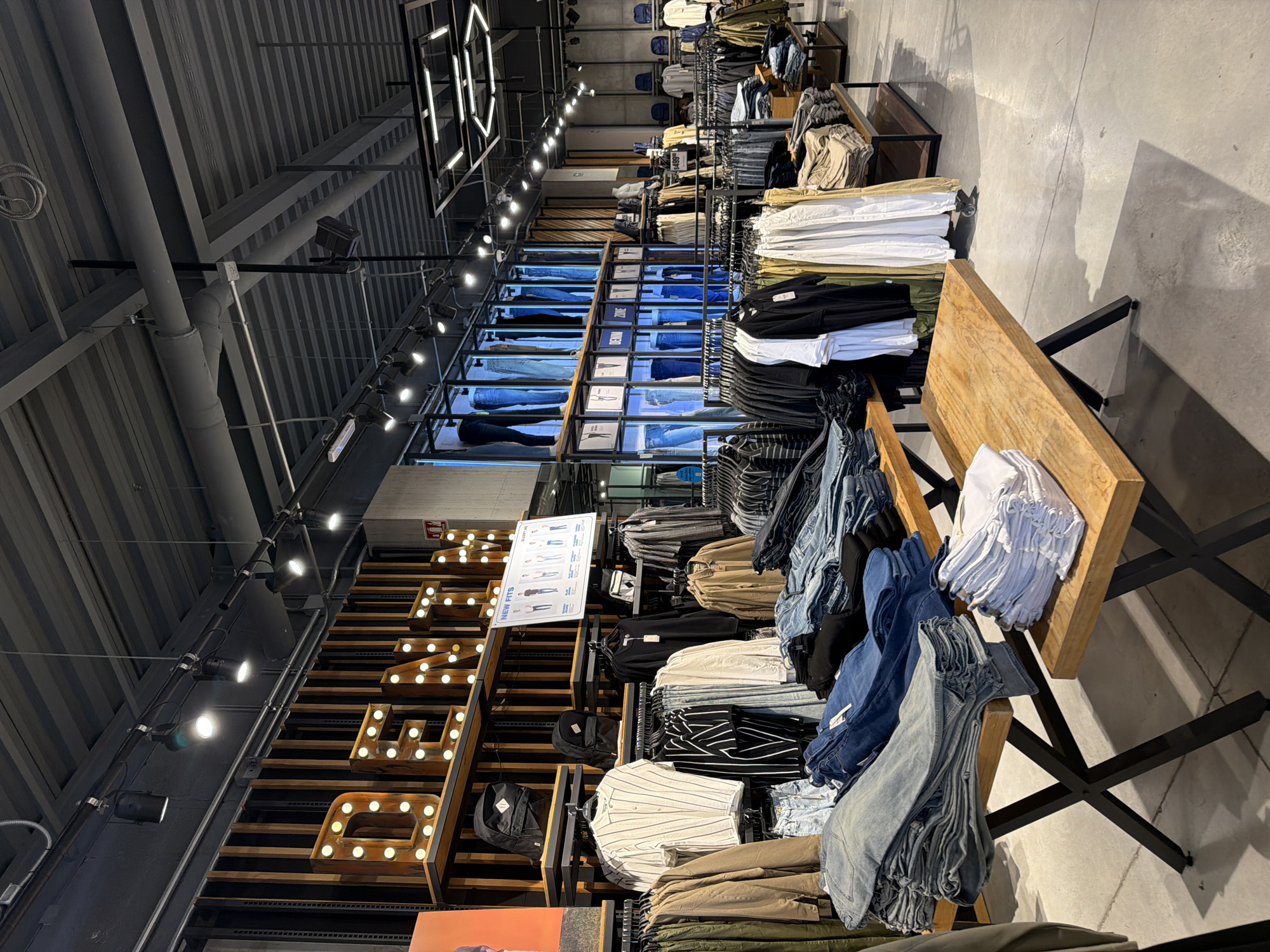 The image depicts the interior of a clothing store in San Pedro Cholula, Mexico. The store features exposed industrial-style ceilings with visible beams and lighting fixtures. Garments, including stacks of folded clothing, are displayed on wooden tables with metal legs. Walls lined with shelves showcase folded denim jeans. Lighted signage and a "New Fits" poster can also be seen. There are no people visible in the frame.