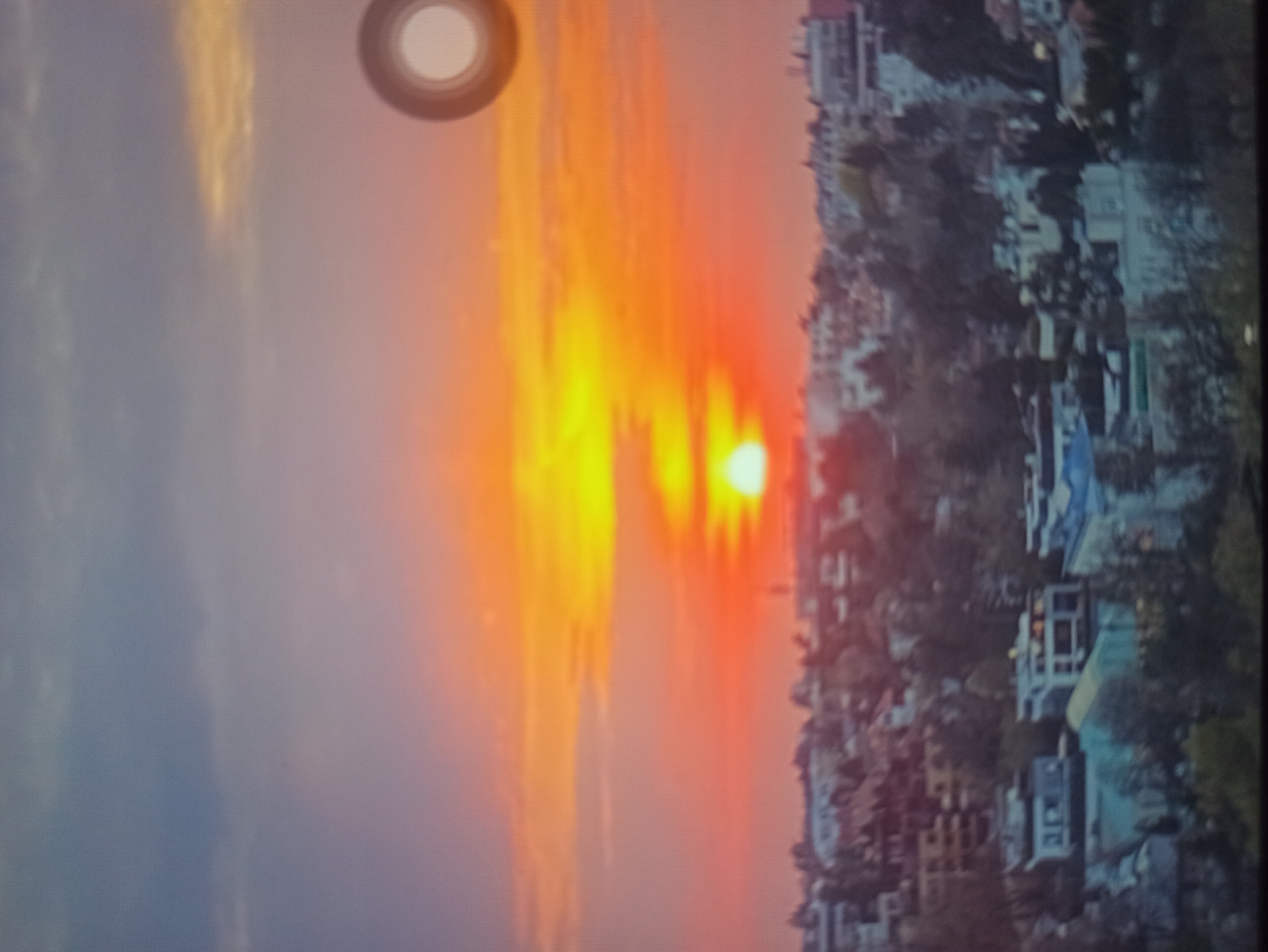 The image displays an urban landscape at either sunrise or sunset, situated within the city of Vozdovac Urban Municipality, Serbia. The sky occupies the upper two-thirds of the frame, dominated by a prominent celestial body, likely the sun, positioned centrally near the horizon. This sun emits intense yellow-orange light, creating a vivid horizontal band that transitions to reds, purples, and blues higher in the sky. Atmospheric haze or clouds are present, contributing to the coloration. A distinct circular bright artifact, potentially a screen reflection or user interface element, is present in the upper-right quadrant of the image. Below the illuminated horizon, the foreground and midground reveal a densely built-up area characterized by multi-story residential and commercial buildings. These structures are interspersed with significant tree cover, indicating a hilly or undulating terrain. While the image is in soft focus, building outlines, windows, and some internal illumination are discernible. No specific individuals, actions, or interactions are visible or identifiable within the scene. The overall image exhibits a grainy texture consistent with a digital capture from a display or a low-resolution source.
