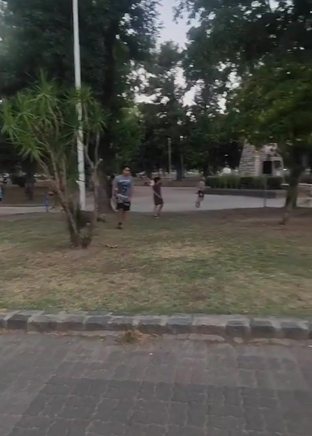 park with several trees, a paved area, a grassy area, and a statue. There are multiple people in the park, including two people who are jogging, one person walking, and one person on a bicycle. A dog also walks in the background. A lamppost is visible. The sky is overcast.