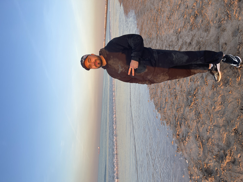A man stands on a beach at sunset, facing the camera while giving a peace sign. He wears a dark hoodie, pants, and sneakers, along with a hat. The beach sand is visible beneath his feet, with the ocean waves gently touching the shoreline. The sky transitions from blue to orange, reflecting the warm hues of the setting sun. A distant orange speck, possibly a boat or light, can be seen on the water.