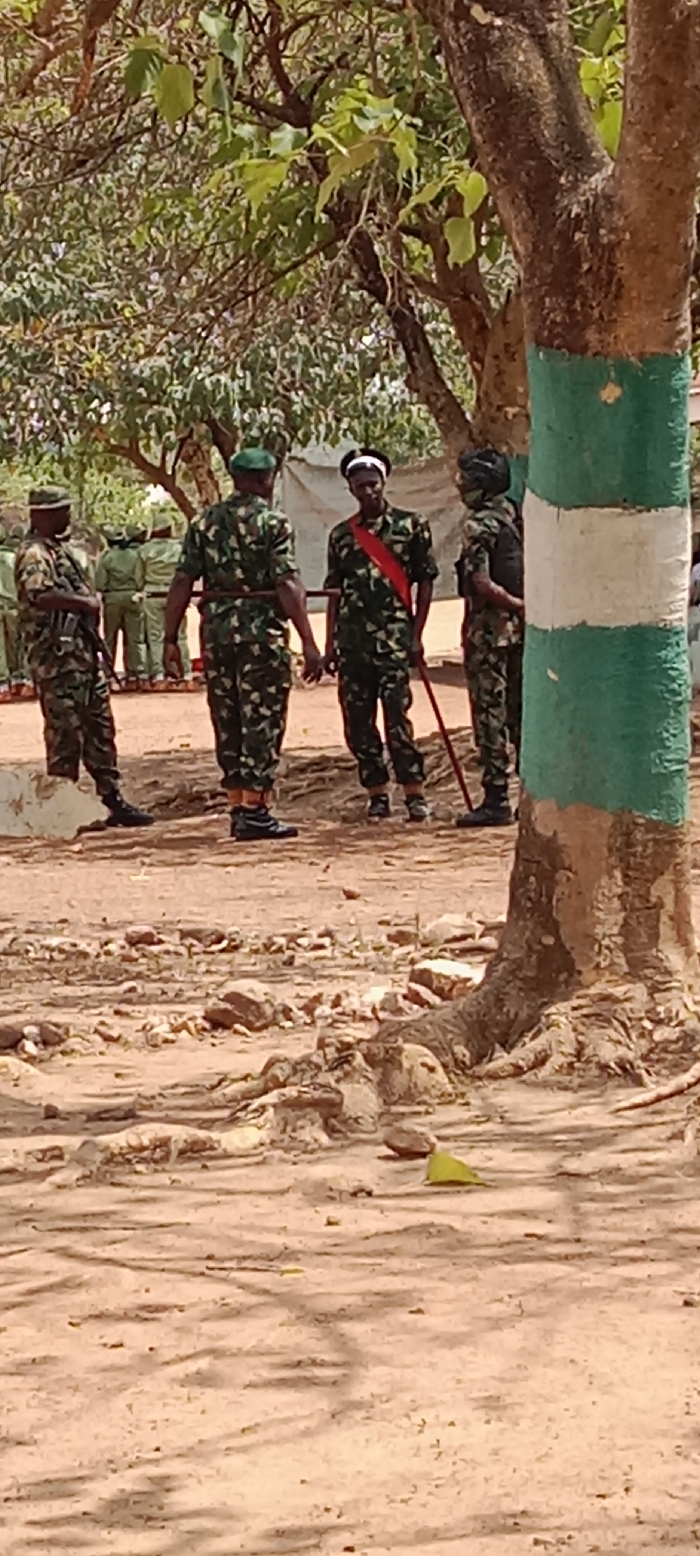 The image depicts an outdoor scene in Iyara, Nigeria, featuring multiple individuals in military-style camouflage uniforms on a dry, reddish-brown, dusty ground with exposed tree roots and scattered rocks. In the immediate foreground, a large tree trunk on the right is painted with horizontal bands of green, white, and green, resembling the Nigerian flag. Four individuals are prominent in the midground: 1. On the far left, an individual in a camouflage uniform and green beret stands, facing right, holding a rifle vertically with its butt on the ground. 2. Next to them, an individual in a camouflage uniform and green beret stands with their back to the viewer, facing towards the right. 3. Center-right, an individual in a camouflage uniform wears a white headwrap, a red sash across their chest, and holds a reddish-brown staff vertically, resting on the ground. They are facing left, seemingly interacting with or observing the individual to their left. 4. To the right, partially obscured by the painted tree trunk, an individual in a camouflage uniform, wearing a dark head covering and a dark vest, stands facing left. In the background, a line of approximately eight to ten additional individuals, also in camouflage uniforms, are visible, standing in an apparent formation. A light-colored structure or tent is partially visible further in the background. The scene is illuminated by clear daylight, casting shadows on the ground. A single fallen yellow-green leaf is visible on the dusty ground in the far foreground.