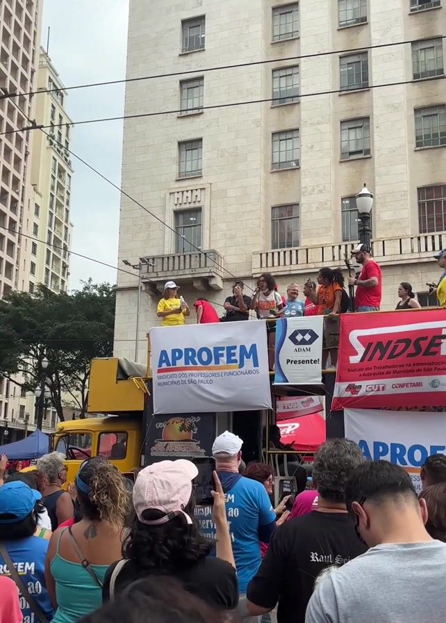 crowd of people gathered at an outdoor rally in a city, likely in Brazil given the presence of Portuguese text. The crowd is gathered around a flatbed truck converted into a stage where several individuals are speaking. A banner on the truck reads "APROFEM, SINDICATO DOS PROFESSORES E FUNCIONARIOS MUNICIPAIS DE SÃO PAULO". Many attendees are wearing blue shirts with text that reads "APROFEM Respeito ao Servidor Público". The location is an urban setting with tall buildings in the background. The mood appears to be active and engaged.