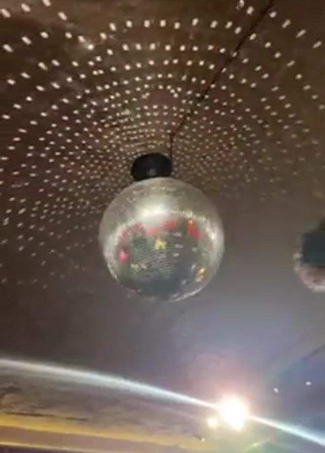 A disco ball hangs from the ceiling. The ceiling is dark and has small points of light projected on it. A man with dark hair walks past the frame, wearing a black hoodie.