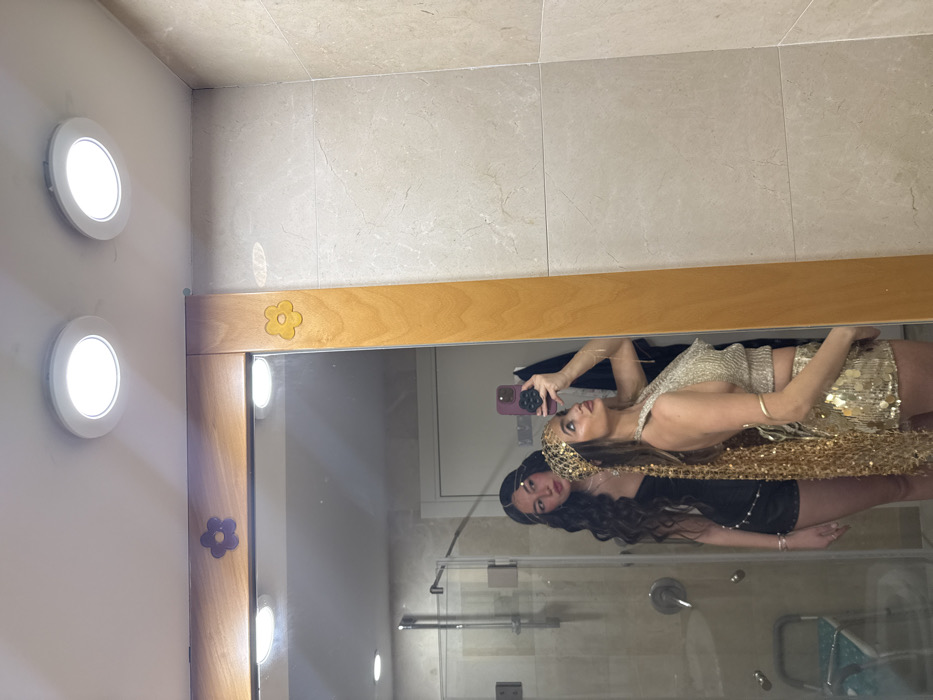 The image displays two females posing for a mirror selfie inside a bathroom located in Tel-Aviv, Israel. The female in the foreground, positioned to the right, is holding a purple-cased smartphone with a black pop socket, reflecting her image. She has long brown hair and is attired in a shimmering gold sequined two-piece outfit comprising a halter-neck crop top and matching shorts. Her head is adorned with an intricate gold mesh headpiece featuring long, trailing gold chains, and a simple gold armband is visible on her upper left arm. Her reflection shows her in a left profile, looking upwards. Behind her, visible in the mirror's reflection, stands a second female with long, dark, wavy hair, wearing a dark-colored, possibly black, strapless top and dark shorts, accessorized with a delicate head chain. She is looking directly towards the phone taking the picture. The large mirror is framed by a light wooden border, which is decorated with a purple flower-shaped appliqué on the upper left and a yellow flower-shaped appliqué on the right side. The bathroom features light beige or cream-colored stone-tiled walls with subtle veining and two bright, circular recessed lights in the white ceiling. The reflection also reveals a glass shower enclosure with chrome fixtures, a white door, and a white metal shower chair or stool.