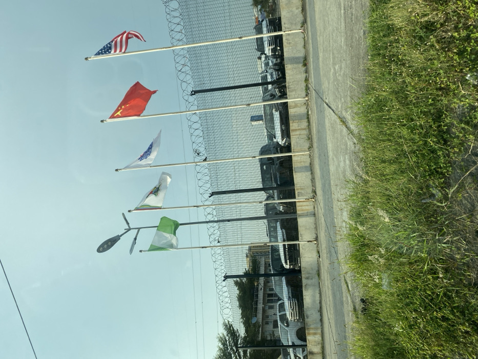 The scene depicts an outdoor environment in Ilado, Nigeria, under a clear, light blue sky. In the mid-ground, five flags are prominently displayed on individual flagpoles. From left to right, these are the national flag of Nigeria (green-white-green), a white flag bearing the emblem of the Rivers State Government, a white flag with the blue logo of the Nigerian Ports Authority (NPA), the national flag of China (red with five yellow stars), and the national flag of the United States of America (stars and stripes). Behind the flagpoles, a dark grey mesh fence topped with coiled razor wire extends horizontally across the image, separating the foreground from a vehicle storage area. Below the fence is a low, light-colored concrete wall. Behind this barrier, numerous new vehicles, primarily SUVs and pickup trucks, are parked in rows. One visible vehicle in the center features the "TOYOTA" brand on its grille. In the far background on the left, a light-colored multi-story building is partially visible beyond the parked vehicles. To the left of the Nigerian flag, a tall street light pole with multiple LED fixtures is present. Overhead, power lines traverse the upper left quadrant. The foreground consists of unkempt green grass and weeds covering a patch of ground. No individuals or specific actions are visible within the frame.