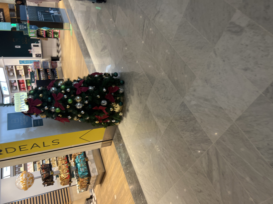 The image depicts an indoor commercial area within Orly Airport in Orly, France. The scene is dominated by a polished, light gray tiled floor with a rectangular pattern, which occupies the lower two-thirds of the frame and exhibits reflections of overhead lighting. A dark gray floor border runs horizontally, separating the foreground from the main retail area. In the midground, an artificial Christmas tree, approximately 1.5 to 2 meters in height, stands adorned with numerous red bows, silver spherical ornaments, green spherical ornaments, and gold spherical ornaments. Larger gold ornaments are present at the tree's base. A small white sign, partially legible as "TIMELESS PARTY," is affixed to the upper portion of the tree. To the left of the Christmas tree, a prominent vertical yellow panel displays the word "DEALS" in large white capital letters. Beyond this panel, a multi-tiered retail display stand holds various packaged products, and a transparent spherical dispenser filled with yellow-orange spherical candies is visible. A wooden slatted wall forms the background in this section. To the right of the Christmas tree, a retail shop interior is visible, featuring shelves stocked with various products. A white counter area is present further back, and a partial sign reading "TABAC" is visible in the upper right corner. One individual, seen from the upper torso, with dark hair and light-colored clothing, is partially visible on the far right side of the frame, standing in the background. The area is brightly illuminated by artificial lights.