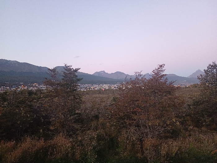 A tranquil landscape features a town nestled amongst trees, illuminated by dusk or dawn light. Mountains form a backdrop, their peaks adding depth to the scene. Foreground vegetation adds texture and a sense of wilderness. The overall impression is one of serenity and natural beauty.