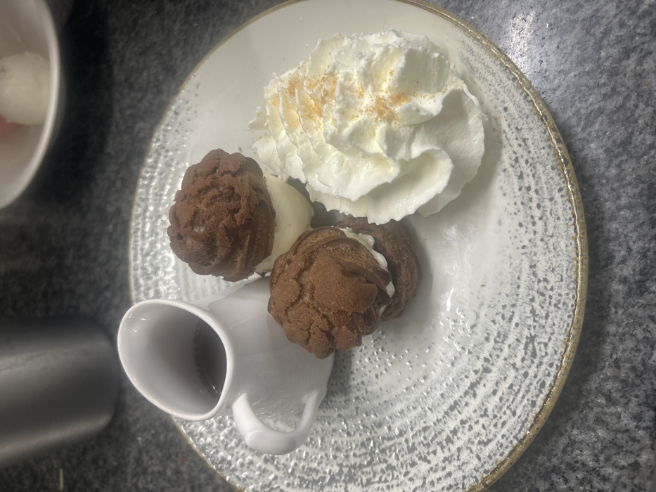 On a dark grey, speckled countertop in Hoenheim, France, a round, light-colored ceramic plate with a grey and white speckled pattern and a brownish-gold rim holds a dessert presentation. The plate features two dark brown choux pastry buns. One bun rests on a white substance, possibly ice cream, while the other is horizontally sliced, revealing a white cream filling. Adjacent to these, a substantial dollop of white whipped cream, dusted with fine orange or gold sprinkles, occupies the right side of the plate. To the upper left, a small, white ceramic jug contains a dark brown liquid, consistent with chocolate sauce. In the blurred background, a metallic cylindrical object is visible on the left, and a white bowl containing a scoop of white ice cream and a red element is partially visible on the right.