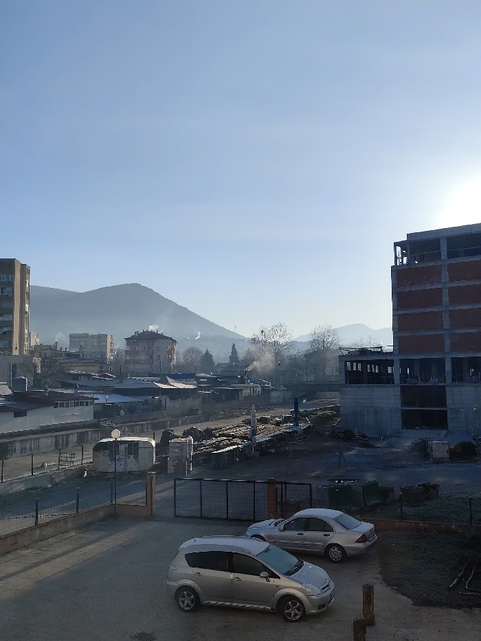 An elevated view captures a cold, clear day in Momchilgrad, Bulgaria. In the immediate foreground, a paved parking area contains two vehicles: a silver Toyota compact MPV and a silver Mercedes-Benz sedan, both covered with a visible layer of frost. The paved area transitions to a dirt patch on the right and is bordered by a dark metal fence and gate system. The midground reveals a mixed-use area. Behind the fence, a seemingly undeveloped or industrial lot contains piles of materials, possibly timber or construction debris. A small, light-colored utility structure with a prominent street lamp fixture stands centrally. To the right, a multi-story building is under active construction, displaying exposed concrete framework and red brick sections on its upper floors, with unfinished window openings. Further back, a bridge spans a visible depression, potentially a riverbed or canal. Scattered older, smaller residential or commercial buildings with dark roofs are interspersed. Several plumes of smoke are visible rising from chimneys among these structures, indicating active heating. The background consists of residential buildings, including several multi-story apartment blocks of varying architectural styles and ages. Bare trees dot the landscape, consistent with a winter season. Distant mountain ranges form the horizon line, partially obscured by atmospheric haze or mist. The sky is clear and pale blue, with the sun positioned low on the right, casting long shadows across the scene and producing a slight lens flare. No people or overt actions are discernible. The overall environment suggests an urban periphery or industrial edge with residential areas beyond.
