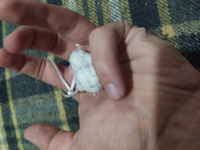 This image depicts a human hand holding a small, white, fibrous object. The scene is documented in Harasta, Syria. The hand, appearing to be an adult's, is positioned centrally, with fingers slightly curled to cradle the object in the palm. The object is roughly spherical, estimated to be 2-3 cm in diameter, composed of white, fluffy material resembling cotton or synthetic fibers. A thin, white, braided string is tied around the object, forming a knot. Several dark, fine strands, possibly hairs, are visible embedded within the white fibrous material. The fingernails are short and clean. The background is a textile surface with a plaid pattern, featuring dark tones (likely black or dark grey) interspersed with yellow lines. No other individuals or distinguishing city features are visible in the frame. The action shown is the act of holding the described object.