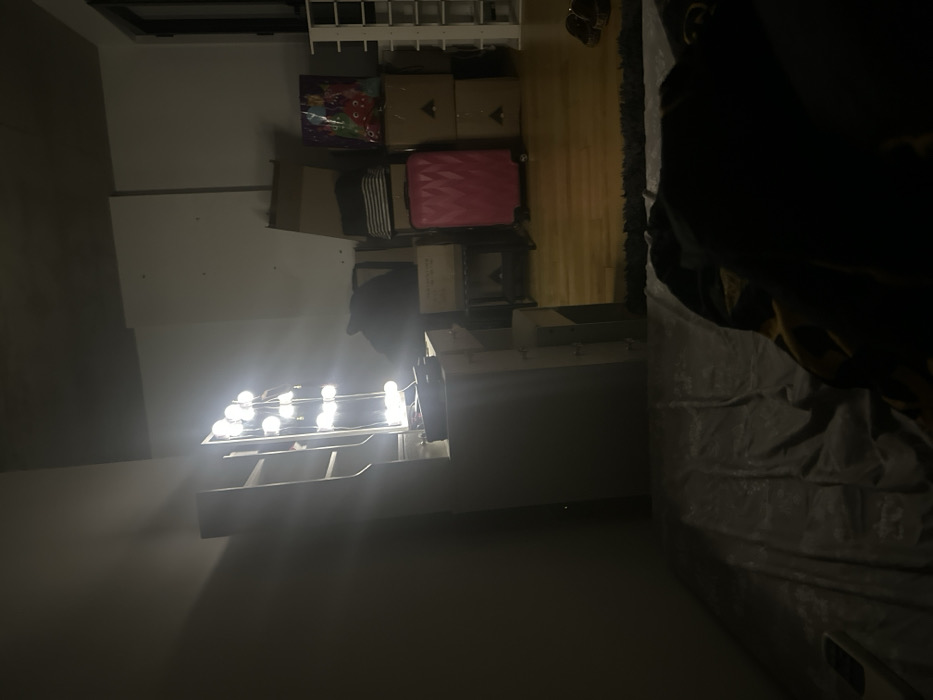 The image displays an interior room, dimly illuminated with a primary light source being a brightly lit vanity mirror
