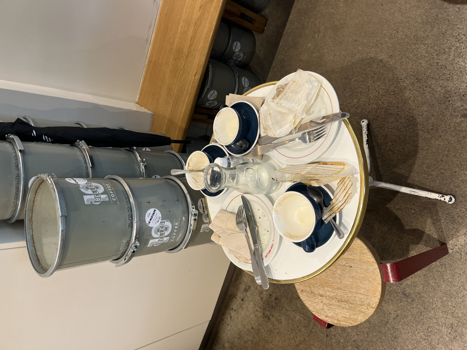 table in a cafe in Issy-les-Moulineaux, France. The table is round and white with a gold rim. There are four empty coffee cups, two of which are blue and white, and three sets of silverware on the table. There are also two napkins, one on a plate and one on the table, and a napkin dispenser. The table is next to a small, wooden stool. The wall behind the table is white and there are shelves holding empty, silver, cylindrical coffee canisters stacked on top of each other. There is a wooden bench, which appears to be part of the cafe seating, against the wall behind the table. The bench is also behind a stack of stacked, grey, cylindrical canisters on the floor. A black umbrella is leaning against the shelves on the wall. The cafe looks to be relatively empty.