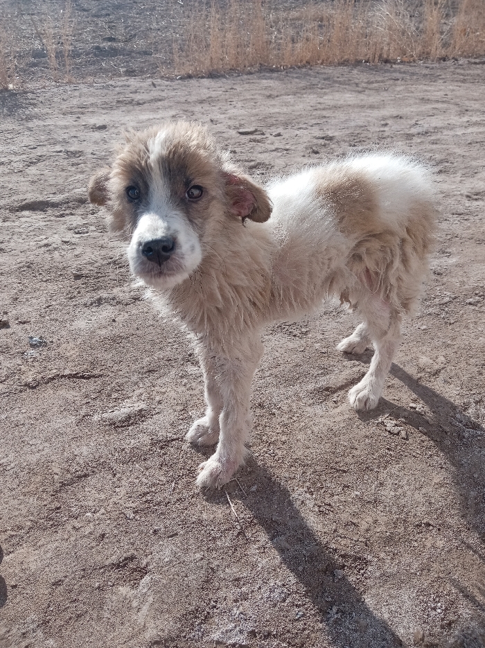 A single canine, appearing to be a young adult dog with a lean build, stands centrally on dry, light brown, compacted soil. Its fur is predominantly white and cream-colored, with distinct patches of light brown on its head, back, and left flank. The fur appears matted, dirty, and unkempt. The dog's face is largely white, featuring a brown patch extending over its left eye and ear, and a subtle brown stripe on its forehead. Its dark eyes gaze directly towards the viewer. The right ear (viewer's left) appears folded or damaged, exposing pink tissue. The background consists of blurred, dry earthen terrain, with sparse, light-brown, dead vegetation faintly visible towards the right side. Direct sunlight illuminates the scene from the left, casting a distinct shadow of the dog towards the lower right of the frame. The location is identified as the city of Chimbay, Uzbekistan.
