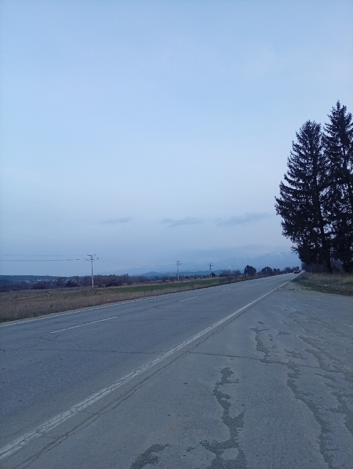 The image depicts a two-lane asphalt road in the vicinity of Shiroki dol, Bulgaria, under a pale, overcast sky consistent with low light conditions