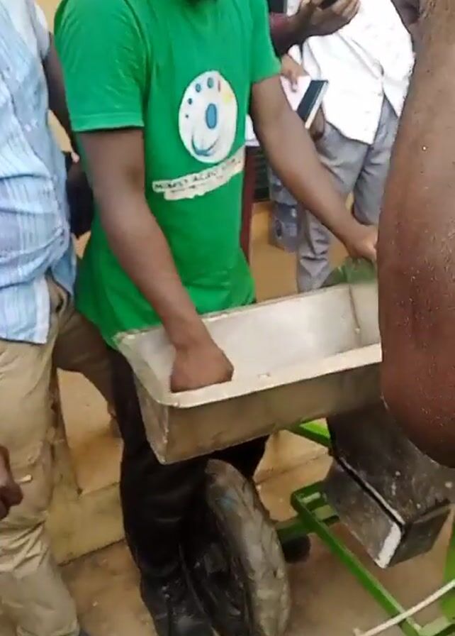 man in a green t-shirt and glasses demonstrating a small machine to a group of people. The machine is made of metal and has a hopper-like top. The man puts his hand into the hopper, possibly to show how the machine works. The machine is mounted on a green frame with a small tire. Several people are watching the demonstration, some holding phones to record it. The setting appears to be outdoors, likely in a yard or near a building.