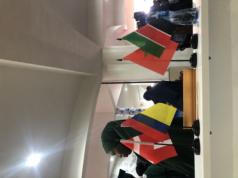 The scene depicts an indoor gathering in Bauchi, Nigeria. In the foreground, a white counter displays four small desk flags on black bases and a plastic water bottle. From left to right, the flags include Denmark (red with white cross) and Colombia (yellow, blue, red vertical stripes), followed by Morocco (red with green pentagram) and Palestine (black, white, green, red with a red triangle). A light brown wooden box is positioned behind the central flags. In the midground, several individuals are visible. A person wearing a dark green hijab is seen in profile on the left, looking left. Another individual in a dark blue hijab faces right, positioned behind the central flags. Additional figures are partially obscured in the background, some wearing head coverings. The environment features light-colored walls and a ceiling with visible architectural beams and columns. A decorative pillar with a blue and white pattern is visible in the mid-background. Bright ambient lighting is present, with a distinct light source causing a flare in the upper left of the frame. No specific actions or interactions between individuals are discernible.