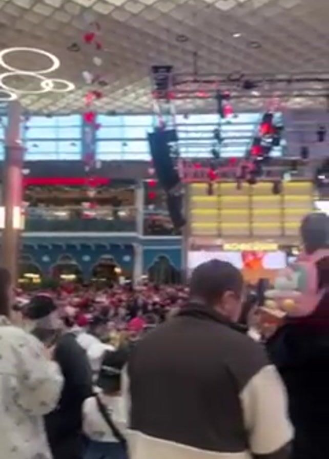 crowded indoor space where a sporting event is being broadcast on a large screen. The crowd seems to be watching the event intently, with some people holding up phones to record or take pictures. There are a lot of people in the crowd, and some children are sitting on adults' shoulders for a better view. The area is decorated with what appear to be red and white hearts hanging from the ceiling, and there are several stage lights set up, possibly for an event to be held after the broadcast. The overall atmosphere seems lively and festive.