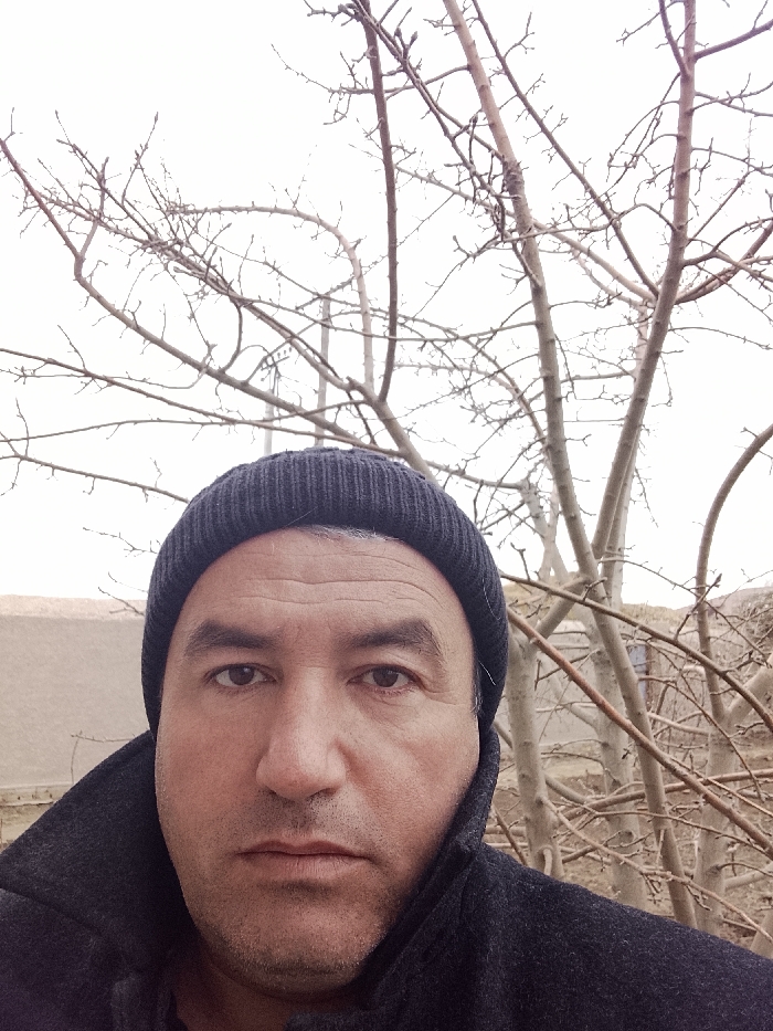 A man with a knitted black hat stands in front of a bare tree on a cloudy day. He wears a dark jacket with a prominent collar. The background includes a building or structure, suggesting a rural or semi-rural setting. The image captures a close-up of the man's face, highlighting his expression and the surrounding environment.