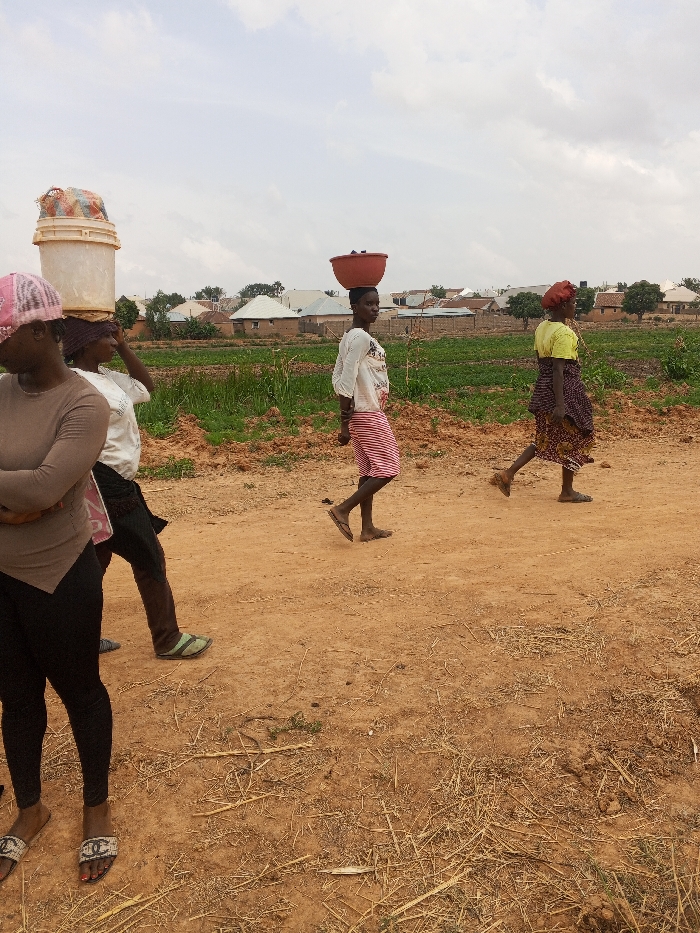 The image depicts a rural or semi-rural scene in Udu, Nigeria, on an overcast day. Four individuals, appearing to be women, are present on a reddish-brown dirt path. In the foreground on the far left, a person with crossed arms wears a light brown long-sleeved top, black leggings, a pink and white patterned headwrap, and black and white patterned sandals. To their right, a second person walks rightward, balancing a large, light-colored bucket containing fabric on their head, wearing a white t-shirt, dark trousers, and light green sandals. Their right hand is raised towards their head. Adjacent to them, a third person walks rightward, carrying a red basin on their head. This individual wears a white patterned long-sleeved top and red and white striped shorts, appearing to be barefoot or in minimal footwear. Further right, a fourth person also walks rightward, wearing a bright yellow top, a patterned dark skirt, dark sandals, and a reddish-brown headwrap. To the right of the dirt path, a field of green crops is visible. In the background, a cluster of single-story buildings with light-colored roofs and some darker roofs are interspersed with trees and sparse vegetation, under a cloudy sky.