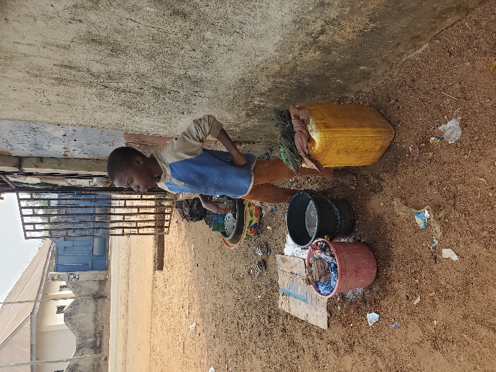 A young person stands outdoors near buckets, a yellow jug, and scattered debris on a dirt ground. They are wearing a blue and beige shirt. One red bucket holds clothes, while another is black. Behind them, a metal gate and a building are visible. A light-colored wall stretches along the top of the image. The scene appears to be in a rural or impoverished area.